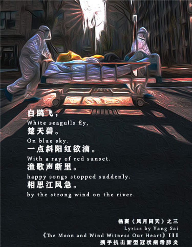 全国青年文艺工作者用自己的方式抗击疫情,共同创作了《风月同天》,为抗击疫情助力加油,向奋战在抗疫一线的勇士们致敬。与之前唱响中国梦的系列歌曲不同的是,杨赛老师团队这次采用了文言文的形式,将中华诗词里面的精华诗词提炼出来,与中国的抗疫情形紧密结合。