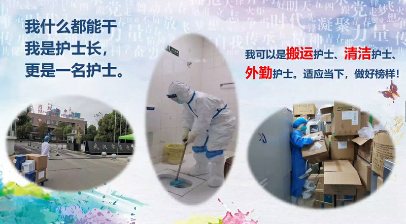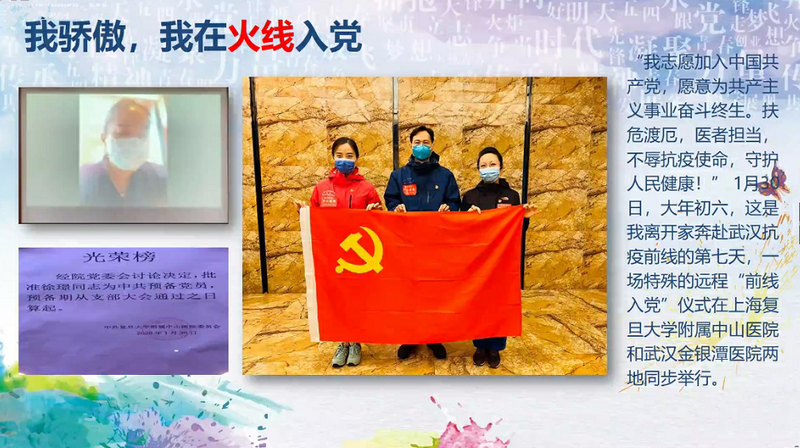 徐璟结合自身的抗疫故事,从疫情就是命令、奋斗一线、火线入党和寄语青年四个方面交流了所思所想。徐璟用一个个生动的一线医护小故事介绍了自己的主阵地、新冠肺炎的“风暴眼”——武汉市金银潭医院。在没有疫情经验借鉴,人力、物力和医疗设备都缺乏的情况下,徐璟说:“用一切可以利用的条件保护自己,战胜肺炎就是最终目标。” 1月30日,离家奔赴武汉抗疫的第七天,徐璟老师以一场特殊的远程“前线入党”仪式火线入党,成为了上海援鄂医疗队第一名光荣入党的医护人员。当谈及入党理解时,徐璟说:“要不忘初心,才能找对人生方向,才能坚持自己的追求,抵达自己的初衷,共同助力伟大中国梦。”