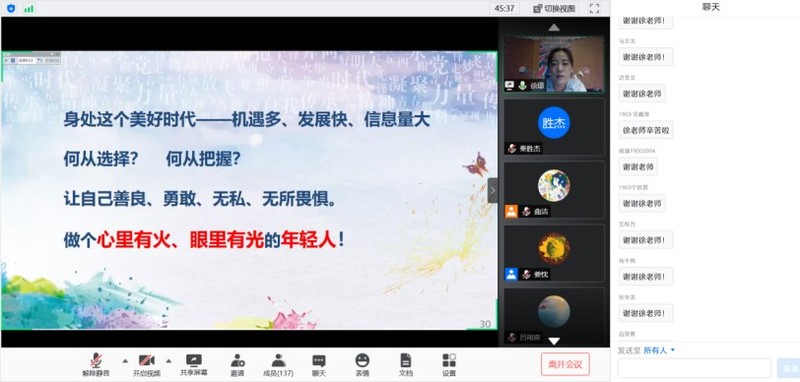 演讲结束后,社会学院学子深受感染,踊跃发言,积极互动。对同学们提出的问题,徐璟结合医务人员经历和抗疫感悟进行了细致真诚的回答,并对所有入党积极分子寄语:“入党并不遥远,新青年只有保持永远善良、永远勇敢的一份心,在党和国家需要的时候挺身而出,才是最难能可贵的。”在温馨感人的一声声祝福和感谢中,本次空中课堂圆满结束。