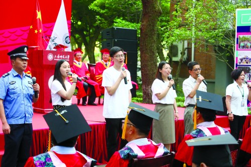 “今天,我们再次在校园‘再见’,也要在校园中说‘再见’。”当校长朱自强、校党委副书记葛卫华带领教职工深情唱响《送别》,唱红了在场所有人的眼眶,在场毕业生纷纷向师长献花致意。