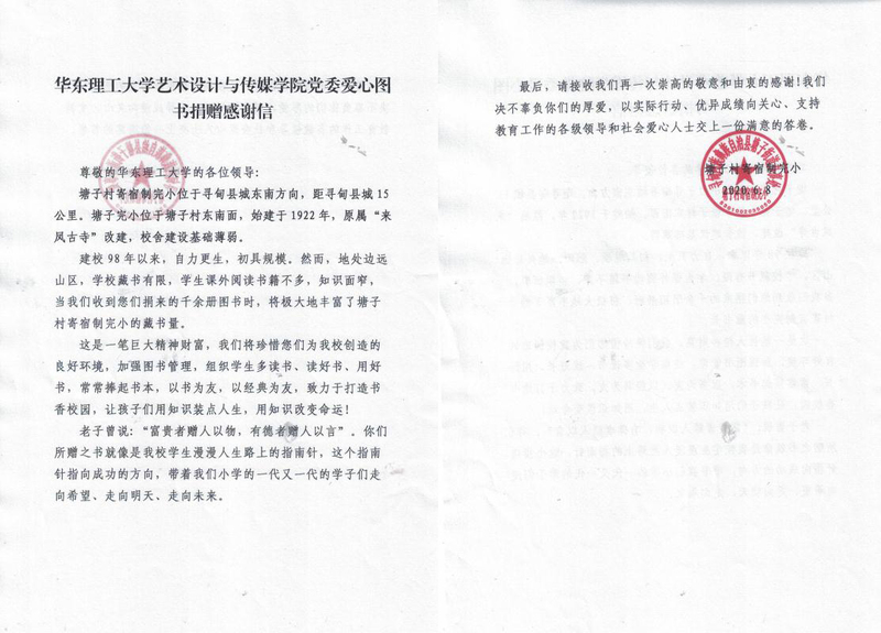近期,艺术学院党委得知云南寻甸塘子街道办塘子村寄宿制完小图书馆缺少适龄儿童图书读物后,迅速组织教工党员开展爱心捐书捐款行动,为定点扶贫单位的儿童奉献爱心。短短五天内,学院教工党支部积极参与,共捐献儿童图书312册,捐款2750元(购买图书459册),并在六一前夕将图书分批寄出。