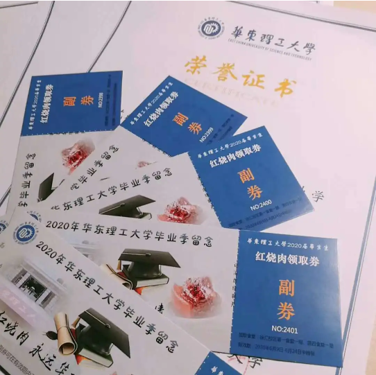 毕业季的这块壮行红烧肉与平时食堂的红烧肉相比,绝对是大块头。学校还同时向毕业生派发“红烧肉领取券”,凭券领取,既可以在食堂用餐,也可以打包带回宿舍享受。