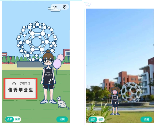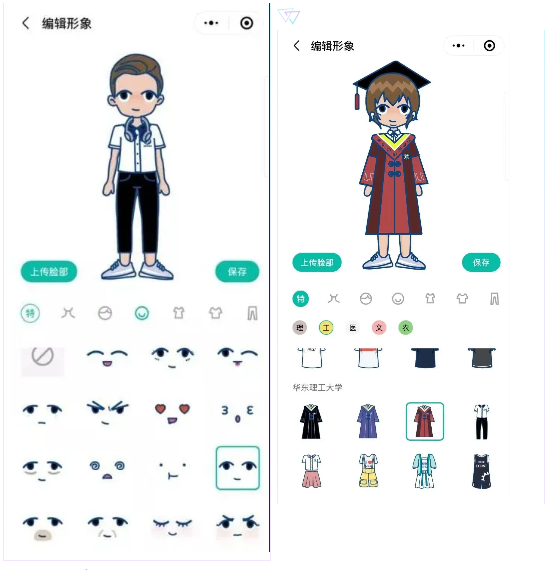有了这个经验,再加上兄弟学校提供的技术支持,他们马上自创了华理的各种卡通场景、形象,以及带有华理元素的独特卡通服装、配件,在云端云换装,完成一张有华理特色的卡通Q版“云合影”,当然也可以上传自己的脸部照片、自定义背景,发挥想象力进行更自由的创作。