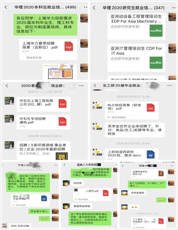 华理就业指导中心的选择是比以往更加主动积极,拓展“朋友圈”。从2月开始,负责市场开拓的老师周全华便主动与更多企业建立联系,通过走访交流,询问招聘意向,目前已有上千家企业加入了微信群。同时,就业指导中心先后开展了《2020届毕业生就业状况调研》《毕业生就业服务需求调研》,通过各院系辅导员收集毕业生就业意向,分门别类建立了考研复试、公务员、教师资格、国家电网、银行、中石油中石化等十多个不同方向的就业微信群。