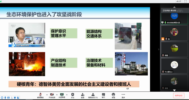 修光利以“坚持习近平生态文明思想,建设美丽中国:党员的责任”给毕业班党员上专题党课。从习近平生态文明思想的诞生、生态文明实践中党员的责任、疫情防控中党员的榜样力量、我们的责任与使命4个方面介绍了我国生态文明建设的发展历程,倡导广大毕业生党员进入社会后,在生态文明建设中要做EHS的传播者、做科技创新的行动者、要有服务国家和社会发展的情怀和坚持,要积极投身祖国建设事业,向疫情防控中的榜样学习,做硬核青年,成为德智体美劳全面发展的社会主义建设者和接班人。