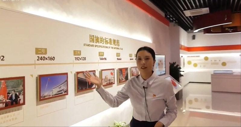 跟随镜头,师生首先来到的是国旗诞生厅。今年是中国共产党成立99周年,忆往昔峥嵘岁月,99年筚路蓝缕、栉风沐雨,不变的是鲜红的旗帜,不变的是赤诚的初心。从缘起,到邂逅,叶素青老师向大家讲述了设计者曾联松与五星红旗之间的故事。通过五星红旗诞生的故事,师生重温了国旗的设计理念——中华人民共和国国旗是五星红旗,为左上角镶有五颗黄色五角星的红色旗帜,旗帜图案中的四颗小五角星围绕在一颗大五角星右侧呈半环形。红色的旗面象征革命,五颗五角星及其相互联系象征着中国共产党领导下中国人民的团结。