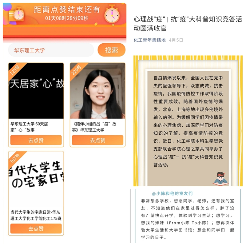 自新冠疫情发生以来,化工学院开展多维度的心理健康教育活动,积极营造健康向上的校园氛围,先后开展了“疫情挑战下的生命对话”心理专题讲座、抗“疫”大科普知识竞赛、我班战“疫”心故事、心理情景剧剧本大赛、心理健康主题班会等系列活动,其中,化工173班的作品《60天居家“心”故事》在“我班战‘疫’心故事全国网络大展示”比赛中脱颖而出,荣获优秀作品奖。