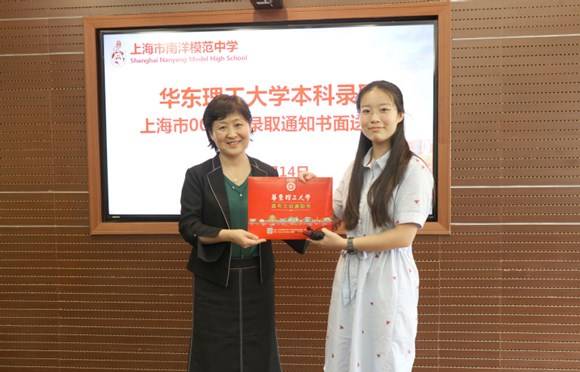 华东理工大学副校长王慧锋向张雨琪送上通知书