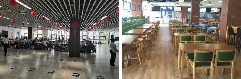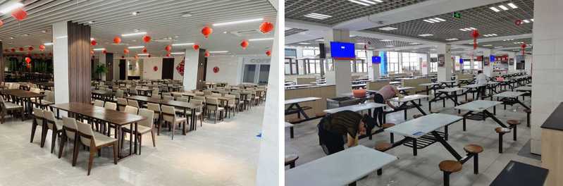 目前,奉贤校区第一食堂已经正常开业,徐汇校区第一食堂一、二层桌椅全部复位,三层也已正常营业,师生们可以在干净明亮的食堂中就餐了。