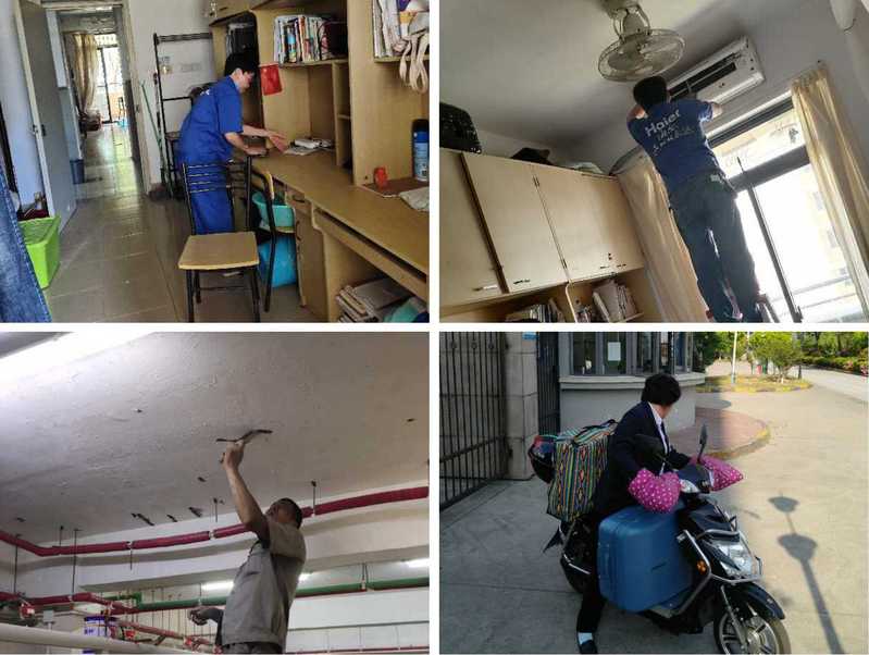 图片说明:工作人员对宿舍通风消毒,保养空调,维修小浴室,宿舍管理员给学生寄送物资