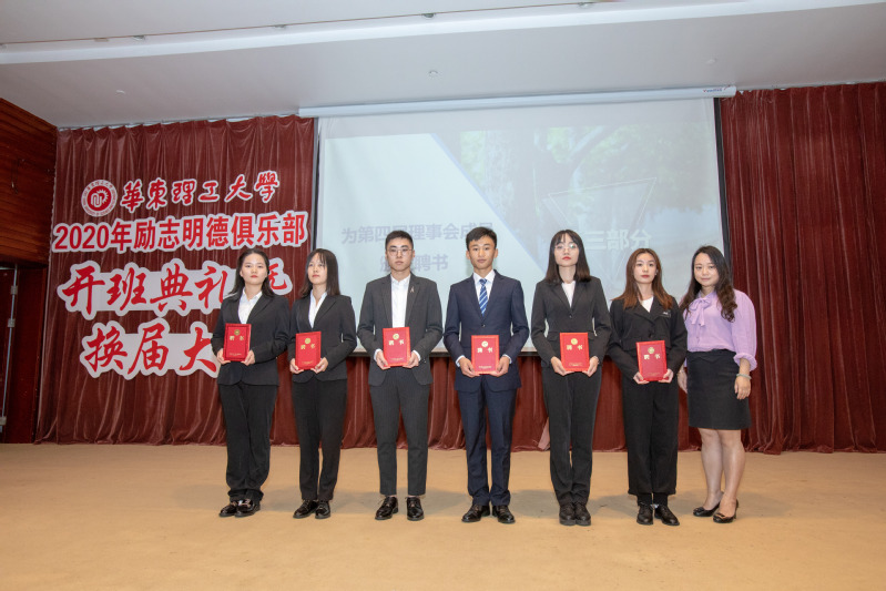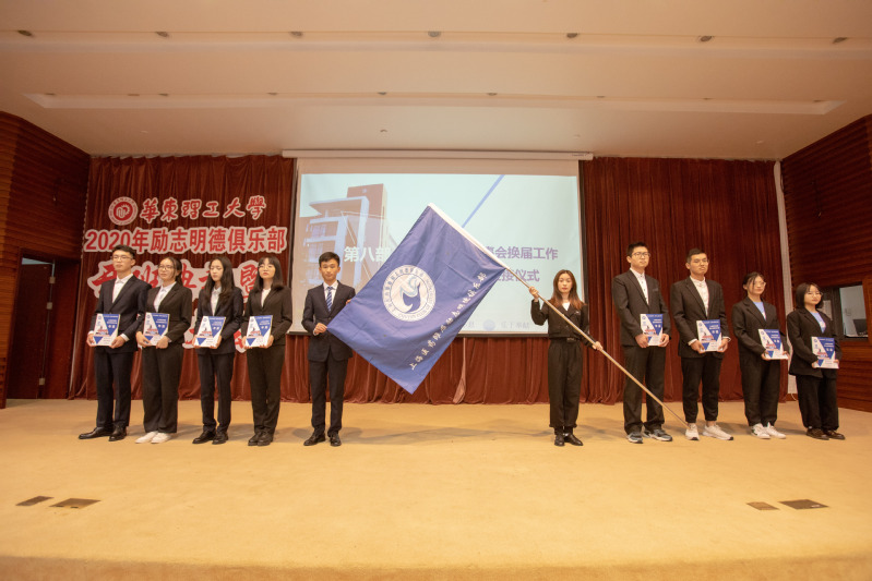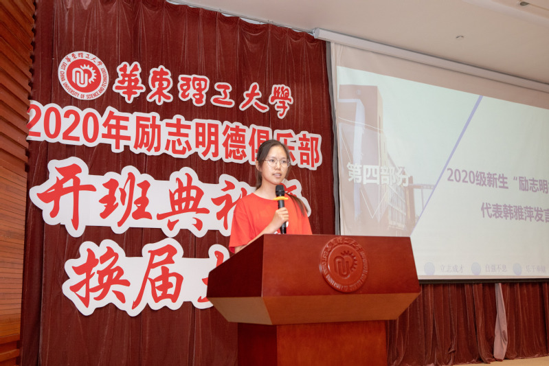2019级“励志明德班”学生马月萍代表俱乐部学生督导发言,欢迎2020级“励志计划”新生加入励志明德俱乐部大家庭。来自新疆乌苏市的新生代表韩雅萍发言,分享了受疫情影响而延后报到的特殊经历,表达了对学校帮扶农村贫困学子圆大学读书梦的感激之情。许慧华、崔姗姗为2020级新生代表佩戴徽章并颁发成长手册。随后,上海医药雏雁励志明德俱乐部理事会举行换届交接仪式。