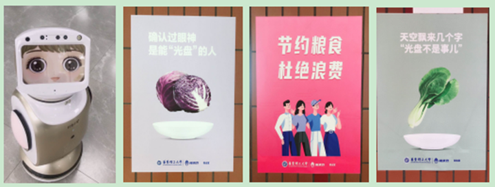 在华理徐汇、奉贤两校区的各个食堂前,宣传海报上醒目的标志、就餐桌上俏皮的摆台、电子屏幕上暖心的话语营造了浓厚的节俭氛围,目之所及都在温馨提示大家爱粮节粮。其中更有一位机器人“小明星”引起学生们的围观,在徐汇校区一食堂“工作”的它,会忽闪着大眼睛,不断地提醒大家“珍惜粮食、杜绝浪费”。