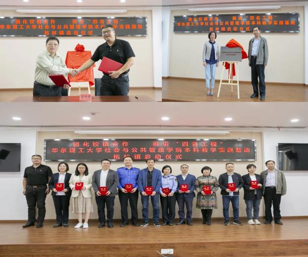 郭东海介绍了柘林镇基本情况,储琰和牛星分别介绍了学院与行政管理系基本情况及教学实践基地项目;石伟杰与储琰代表双方签订了《本科生产学研实践基地合作协议》;鲁瑛和张广利共同为教学实践基地揭牌;张广利和储琰为特聘实践导师颁发聘书;柘林镇城运中心书记、主任沈磊与行政管理专业2018级本科生曲洁分别作为实践导师与实习学生代表作表态发言。启动仪式后,学院师生一行在鲁瑛的陪同下,实地参观了柘林镇规划展示厅和党群服务中心,双方还就实践基地建设等相关事宜作了进一步交流。