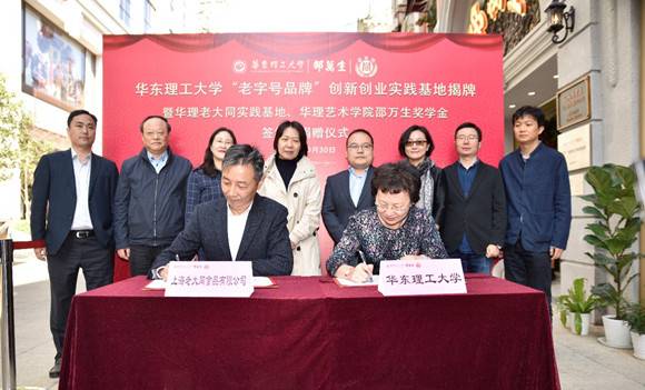 仪式上,黄婕与陈杰共同签订了华东理工大学——上海老大同食品有限公司“老字号品牌”创新创业实践基地合作协议。李金国代表上海邵万生商贸有限公司向艺术学院捐赠20万元教育发展基金,赵菡代表学院接受捐赠。尹旭峰与王慧锋共同为“老字号”创新创业产教实践基地揭牌。傅宁、彭明、赵黎明、司忠业分别为邵万生、三阳南货店、黄隆泰、老大同四家店授牌。