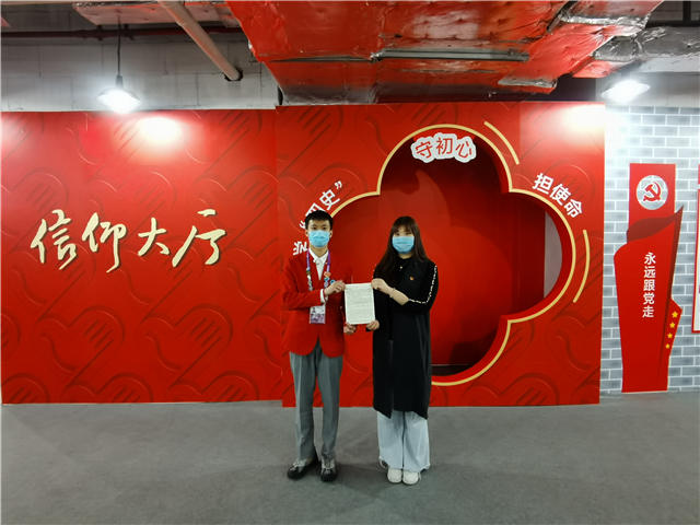 作为第三届中国国际进口博览会的志愿者,潘俊松切身感受到,在经历了疫情后,进博会给全世界特别是中国人民带来的力量,也被中国共产党带领全国各族人民取得的抗“疫”成果而感动。在听完习近平总书记在第三届进博会开幕式上的主旨演讲后,心潮澎湃的他当晚就写下了入党申请书,接下来几天,马不停蹄的工作让他的计划一直没能实现。