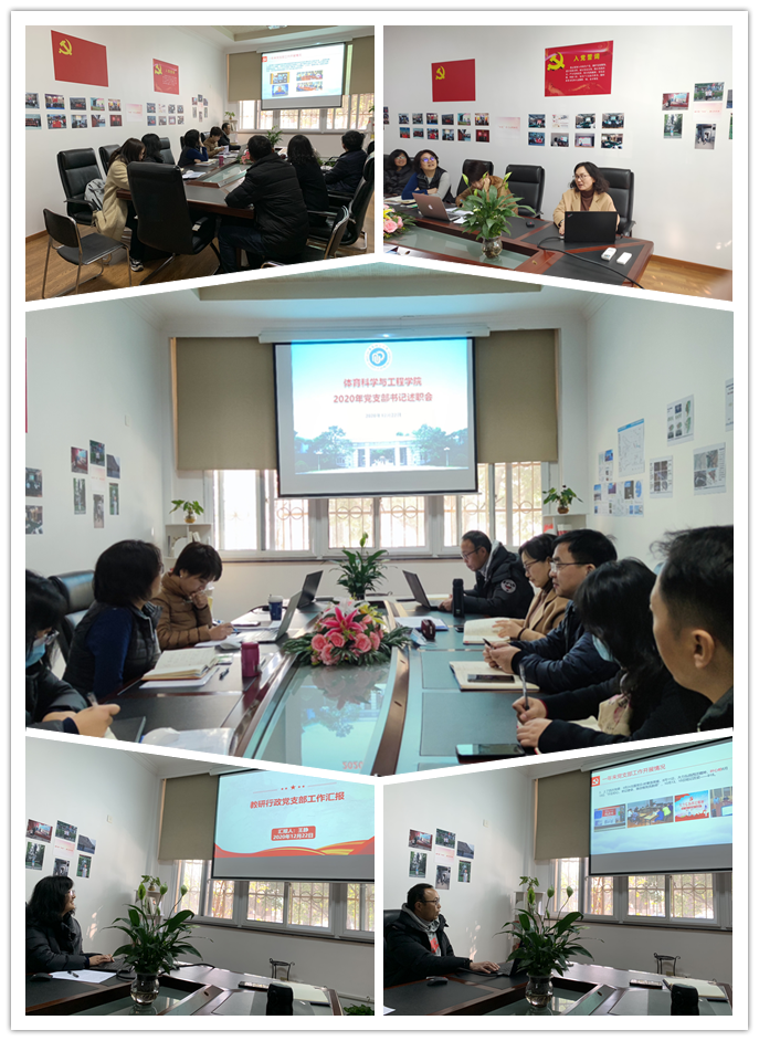 会上,各党支部书记分别从重点工作、特色亮点、存在不足和整改方向等方面认真总结回顾了2020年各党支部工作的开展情况,同时分享了各党支部的特色活动和经验做法。例如,教研行政党支部通过线上组织生活开展疫情防护的宣传和科普工作、组织党员在线重温入党誓词活动;教工研究所党支部开展了“云游红色地标聆听历史回响”活动;公共体育系党支部在疫情期间与安徽塔坊学校结对开展了线上组织生活;学生党支部开展了“读书分享会”“学四史迎百年——2020我的电影党课”等主题党日活动。