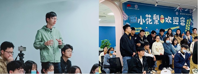 龙东辉教授结合多年在科研育人一线的经历和感悟,为同学们带来了一场别开生面的科研盛宴。龙东辉从事于航天热防护材料的研究,并担任华理-航天八院热防护技术联合实验室主任、特种高分子及相关技术教育部国防重点实验室副主任,是同学们最为喜爱的青年教师之一。小花梨新媒体工作室轻松的交流氛围、优秀青年教师的悉心传授、同学们求知的专注目光,一场令人印象深刻的研讨拉开序幕……