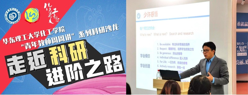 3月11日晚,全新升级的化工学院“青年教师周周讲”系列科研沙龙之“走近科研 进阶之路”讲座于奉贤校区小花梨新媒体工作室举行。本次活动特别邀请到龙东辉教授主讲。为满足同学们满满的期待,活动通过线下面对面互动研讨与线上同步直播的方式开展,直播人气量近600人次。