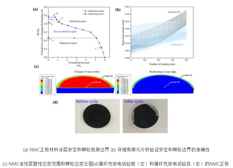 研究团队就目前最为关注的LiNixMnyCozO2(NMC)三元正极材料为研究对象,基于电池充放电实验和有限元分析模型(图1),应用自主研发的新一代先进数值方法计算了NMC活性层在循环扩散诱导应力和恒定机械载荷下的安定棘轮边界(图2),为理解不同充放电工况下电极材料的不同损伤机理铺平了道路。另外数值结果也表明,正极中心存在低周疲劳现象,正极边缘存在棘轮现象,与实验结果吻合(图2)。论文进一步考虑了NMC活性层厚度对电池性能的影响,结果表明反向塑性极限和棘轮极限随厚度的增加而增大,而随着活性层的变薄正极在受到循环扩散诱导应力时变得更加危险,必须综合考虑厚度对NMC活性层力学破坏和电化学性能的影响。此外,结合电化学实验数据,研究团队进一步得到了NMC活性层的疲劳损伤寿命曲线,可以有效地预测锂离子电池电极材料活性涂层在不同充放电工况下的使用寿命。