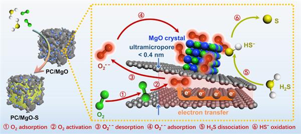 为了揭示活性炭的室温氧活化机理,本研究通过密度泛函理论计算发现,超微孔(孔径约为0.4纳米)的限域作用和具有电子转移能力的导电碳化学结构是氧分子室温活化的必要前提。进一步理论计算和实验结果表明,氧化镁等金属氧化物能够对氧自由基进行有效富集,进而提高活性炭体系中的氧自由基浓度,提升硫化氢的室温催化氧化性能。这一发现为氧分子室温活化的内在起源提供了见解,同时也对炭基多孔材料在环境治理中发挥的作用提供了思路。