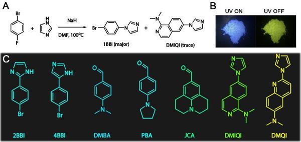 (A)1BBI的合成及其过程中产生的微量副产物;(B)含有微量副产物DMIQI的1BBI的长余辉室温磷光现象;(C)实验室筛选出的七种“添加剂”的结构及室温磷光颜色