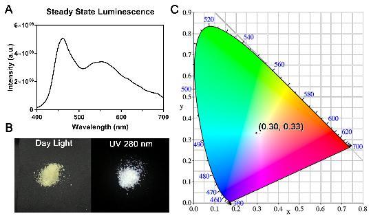 当添加组分本身存在荧光发射,其构成的双组分体系具备荧光和室温磷光双发射现象。由于荧光和磷光的激发过程不同,导致双发射的波长依赖特性。DMQI(二甲氨基喹啉咪唑)和1BBI双组分体系的蓝色荧光和黄色室温磷光组成,使得其在280纳米激发下产生白光发射。双组分体系在有机发光半导体照明领域有着潜在的应用前景。
