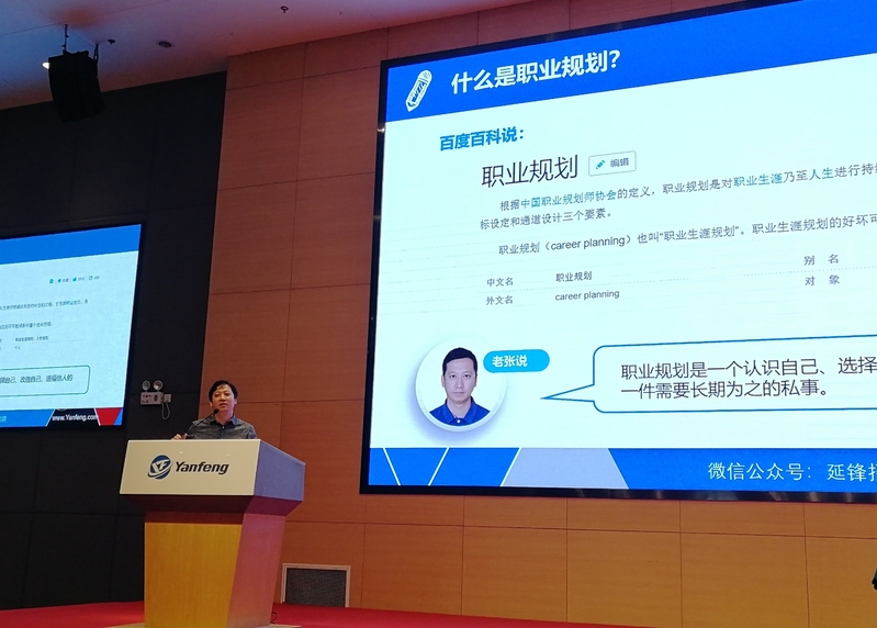 随后,张佳伟介绍了延锋公司的发展历程、业务板块、技术创新和人才培养体系等方面内容,并为同学们带来了一场精彩的职业规划讲座。他希望,同学们从认清自我开始,注重自身综合素质和专业能力的培养,选择适合自己的行业和企业,做好生涯规划,为“从书包到公文包”的转变做好准备。