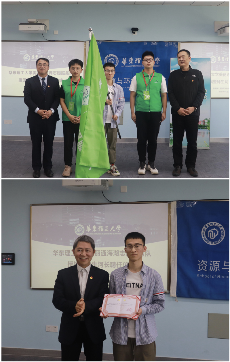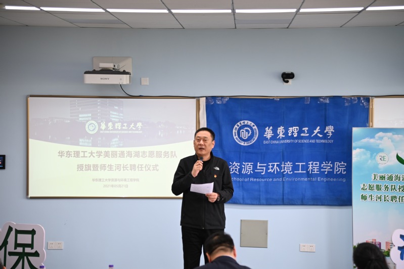 聂琦在致辞中对华理资环学院美丽通海湖志愿服务队的成立和初期的工作表示肯定和支持。他回顾了2019年奉贤区生态环境局与华理资环学院党建共建后在人才培养、科技服务等方面开展的合作情况,对学院教师发挥技术专长服务奉贤地区发展表示了感谢。2021年世界环境日主题为“人与自然和谐共生”,他希望青年学子牢固树立尊重自然、顺应自然、保护自然的理念,建设人与自然和谐共生的美丽家园。他希望在区生态环境局和华理资环学院的共同努力下,为改善校园河流环境,增强师生环保意识出一份力,将美丽通海湖志愿服务队共同打造成知行合一、专业过硬、优势创新的志愿服务队伍。随后,聂琦和修光利共同为美丽通海湖志愿服务队志愿者代表授旗并佩戴志愿服务胸牌。汪华林为奉贤校区学生河长楼江炜颁发河长聘书。