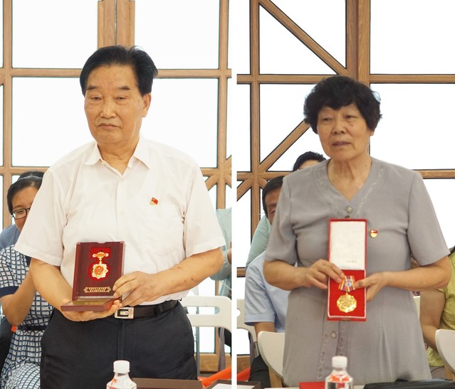 会上,王俊、张启芳老师夫妇还为大家展示了他们获得的两枚极其珍贵的纪念勋章,分别是2019年获得的“庆祝中华人民共和国成立70周年”纪念章和1996年获得的中国航天奖,这两枚奖章是对两位老先生科研工作的最大褒奖。捧着沉甸甸的奖章,两位老教师动情地表示“为国、为党奋斗,祖国不会忘记,人民不会忘记你”。
