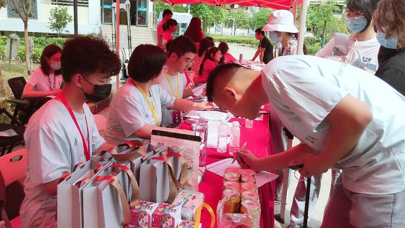 新生报到当日,研究生学长学姐将亲手研制的香水洗手液送到大一新生手中,为他们做好校园防疫提供了多一道安全防护。