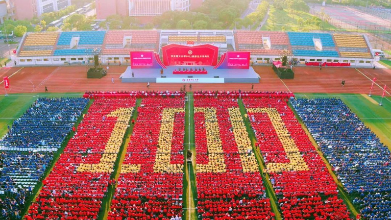 9月23日下午,华东理工大学奉贤校区体育场,在大片的中国红、华理蓝的整齐方阵中,由金黄色组成的数字“100”格外醒目耀眼——华理9000余名本科生新生和研究生新生,正用他们的“青春物语”庆祝中国共产党成立100周年,为美丽校园注入新的活力。