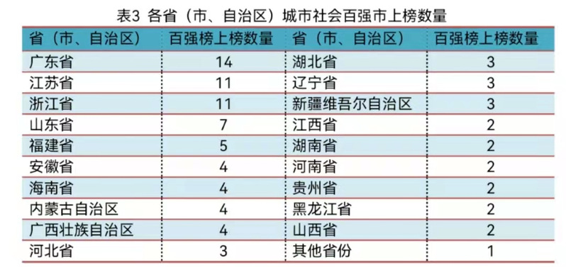 从地域分布来看,上榜城市的空间集聚效应仍非常明显,东部沿海城市上榜城市最为集中,东北和西南地区上榜数量较少,这在一定程度上反映了我国城市社会发展的不平衡性和不充分性。与此同时,内蒙古、广西和新疆等省份上榜城市数量较多,也体现了国家的共同富裕和区域均衡战略。