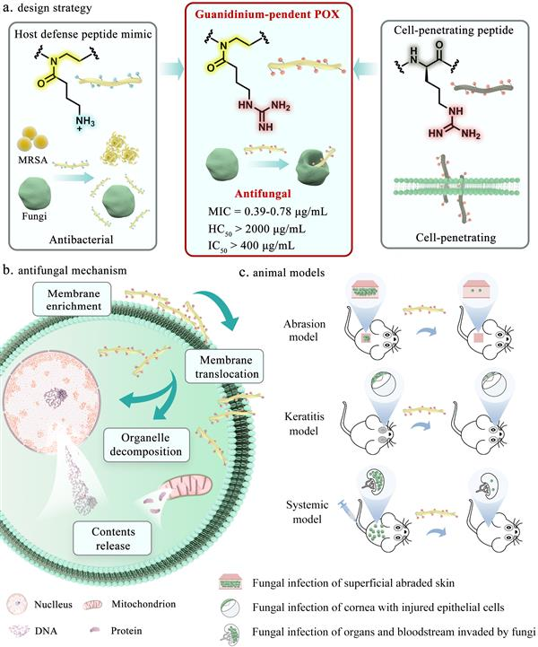 在前期研究中,刘润辉教授课题组首次发现聚(2-噁唑啉)可以作为新一类的功能性多肽模拟骨架结构,并以侧链氨基功能化的聚(2-噁唑啉)模拟宿主防御肽获得高效抗耐药细菌聚合物。在本研究中,研究人员在前期工作的基础上,受细胞穿透肽的启发,通过模拟宿主防御肽设计了一类短链长的胍基功能化聚(2-噁唑啉),能够有效穿透真菌细胞膜从而杀死真菌,实现体外高效的选择性抗真菌功能。优选化合物在小鼠皮肤擦伤感染模型、眼角膜感染模型以及系统感染模型中展示了高效的抗耐药真菌感染治疗效果。该工作为设计新型高效选择性抗真菌化合物以对抗耐药真菌感染提供了一种新策略。