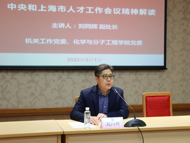 为深入学习习近平总书记关于人才工作的重要论述、贯彻新时代人才工作的新理念新战略新举措和落实上海市人才工作会议的相关要求,3月1日下午,机关工作党委、化学与分子工程学院党委围绕人才工作专题联合开展教职工理论学习,邀请市委组织部人才工作处刘同辉副处长作辅导报告。学习会由校党委副书记、机关工作党委书记、党委办公室主任沈海涛主持。