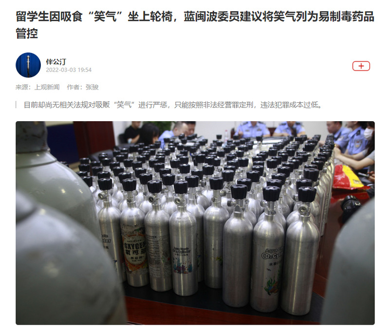 蓝闽波收集公开报道发现,2019年至2020年9月,北京警方对“笑气”在京吸贩滥用现象,累计破获“笑气”类案件20余起,抓获50余人,缴获“笑气”近30万支。2021年7至8月西安警方查获多起非法贩卖“笑气”案。中央电视台多次报道了长三角地区和海南等地众多青少年吸食笑气,造成严重伤害,警方严厉打击破获多起该类重大案件。