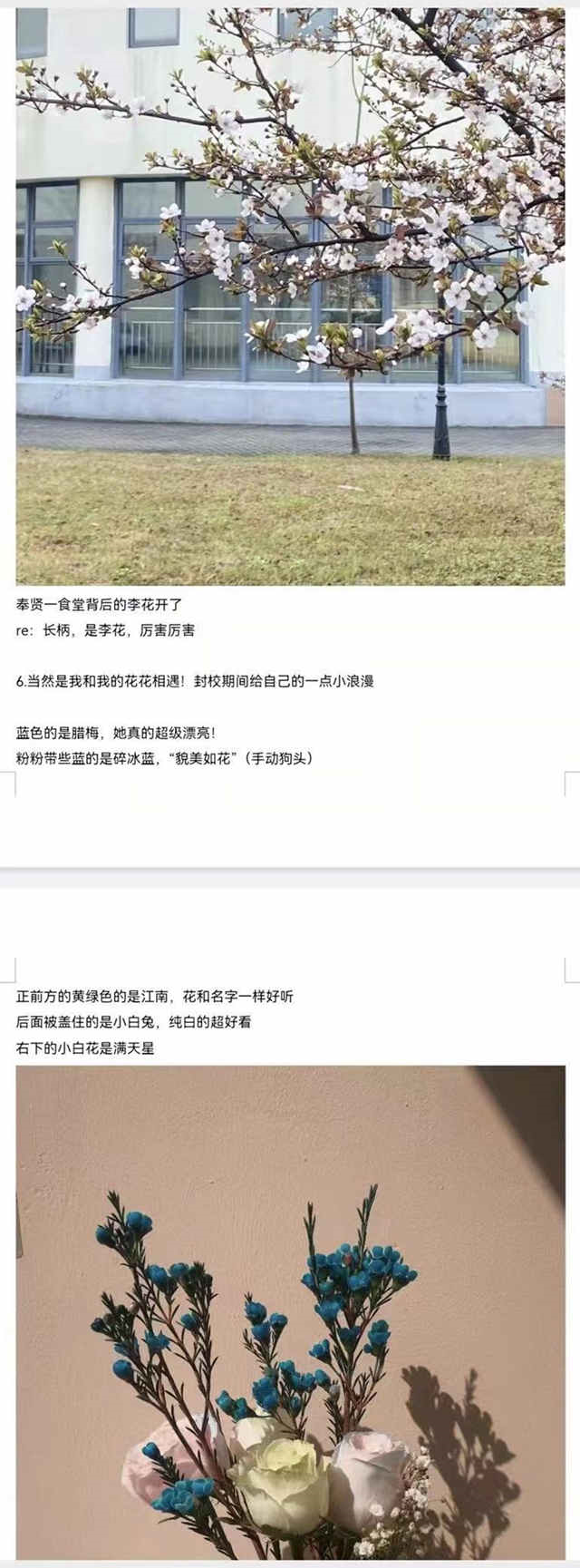 这份浪漫的背后,原来是学校印刷包装工程系的志愿者们提前准备的惊喜,上周末在收到学校进一步严格校园管理的通知后,他们自发购买鲜花、手写祝福语,忙碌了一天,再悄悄藏在校园的角落里,一枝花、一张祝福纸条,是对同学们的鼓励,是给每一位守“沪”者的浪漫。