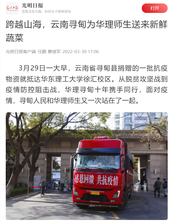 作为10年来心手相连的好伙伴,华理的疫情防控工作牵动着千里之外寻甸人民的心。得知学校的情况后,寻甸各族人民群众第一时间投入到物资准备工作中。蔬菜是老乡们亲手从田里采摘的,矿泉水是来自当地甘甜的清泉,淳朴的寻甸人民希望把这份最真挚的情谊,送给他们远在上海的亲人。