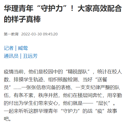 疫情当前,他们是校园中的“精锐部队”,统计在校人数、排摸学生轨迹、组织核酸检测、当好“送餐员”……一张张信息完备的表格、一支支纪律严整的队伍,有条不紊,秩序井然,他们在楼层间奔忙,用辛勤的付出为学生们带来安心,他们就是——“层长”。一起来听听这群华理青年“守护力”的战“疫”故事吧。