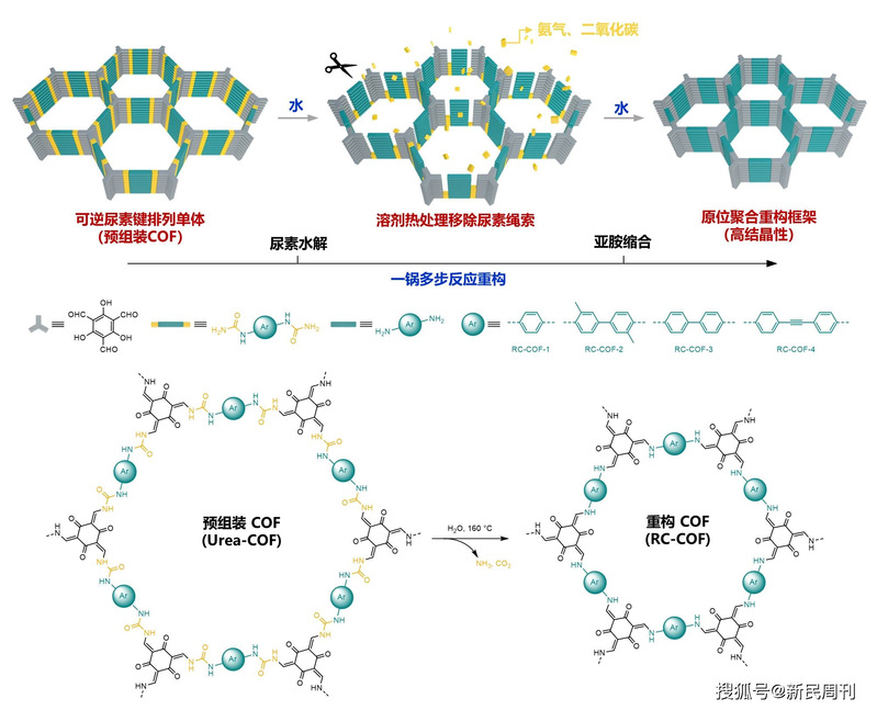 借鉴了超分子化学纳米限域反应和动态共价化学的理念,研究团队巧妙地将框架共价组装和不可逆共价键分开,提出了“重构共价有机框架”的合成策略:利用可逆共价键,将有机基元“预组装”成晶态框架,再进行合成后的“限域重构”,由此实现高稳定性结晶COF在常规合成条件下的高效制备和可规模化生产。