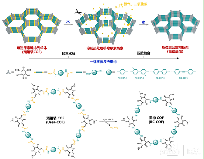 在实际操作中,研究人员采用方向性强且可逆性高的尿素键作为“共价绳索”,将分子基元预组装成高结晶性COF框架后,再在更高的反应温度下,利用水分子作为“剪刀”剪断“共价绳索”,释放出氨气和二氧化碳后被保留下来的芳胺和醛的官能基元在纳米限域的框架中原位聚合和不可逆异构化,完成了高稳定性框架的预设性重构结晶。