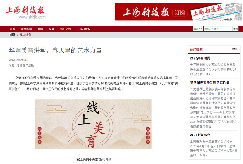 疫情挡不住华理校园的春风,也无法阻挡华理人学习的热情。为了给闭环管理中的全校师生带来美的享受和艺术体验,学校充分利用线上教学资源开设美育类课程及讲座,组织了艺术学院近30名优秀专业教师,推出“线上美育小讲堂”(以下简称“美育讲堂”),3月17日起,每个工作日的晚上准时上线,为全校师生带来线上美育讲座。