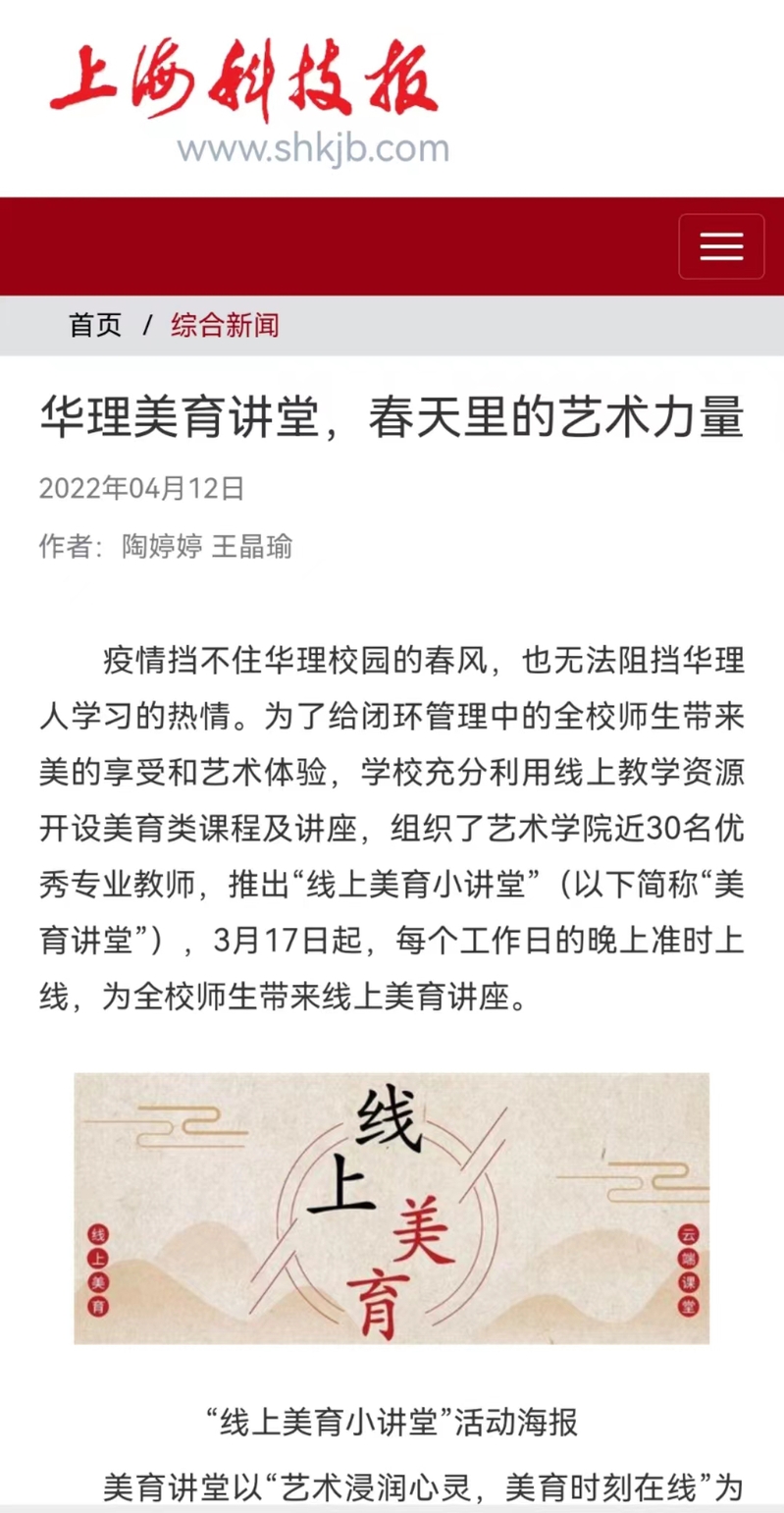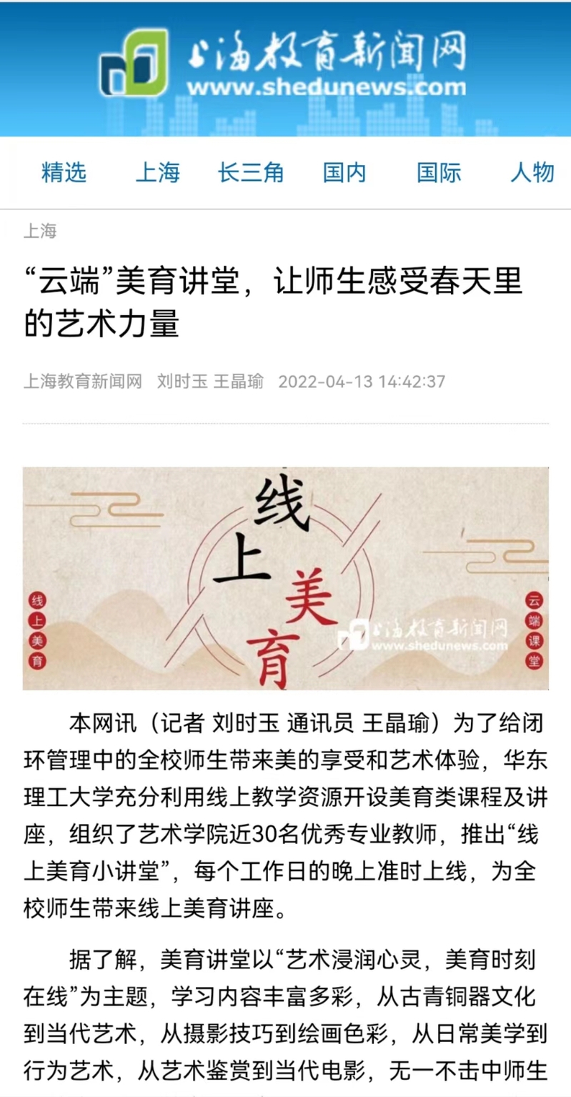 自3月17日起,学校组织艺术学院近30名优秀专业教师,推出“线上美育小讲堂”系列讲座,每个工作日的晚上准时上线,从不同艺术领域角度为师生带来一场场文化艺术饕餮盛宴,用美育浸润心灵,以艺术丰满生活。东方网、周到上海、上海教育新闻网、第一教育、上海科技报等多家媒体进行了报道。