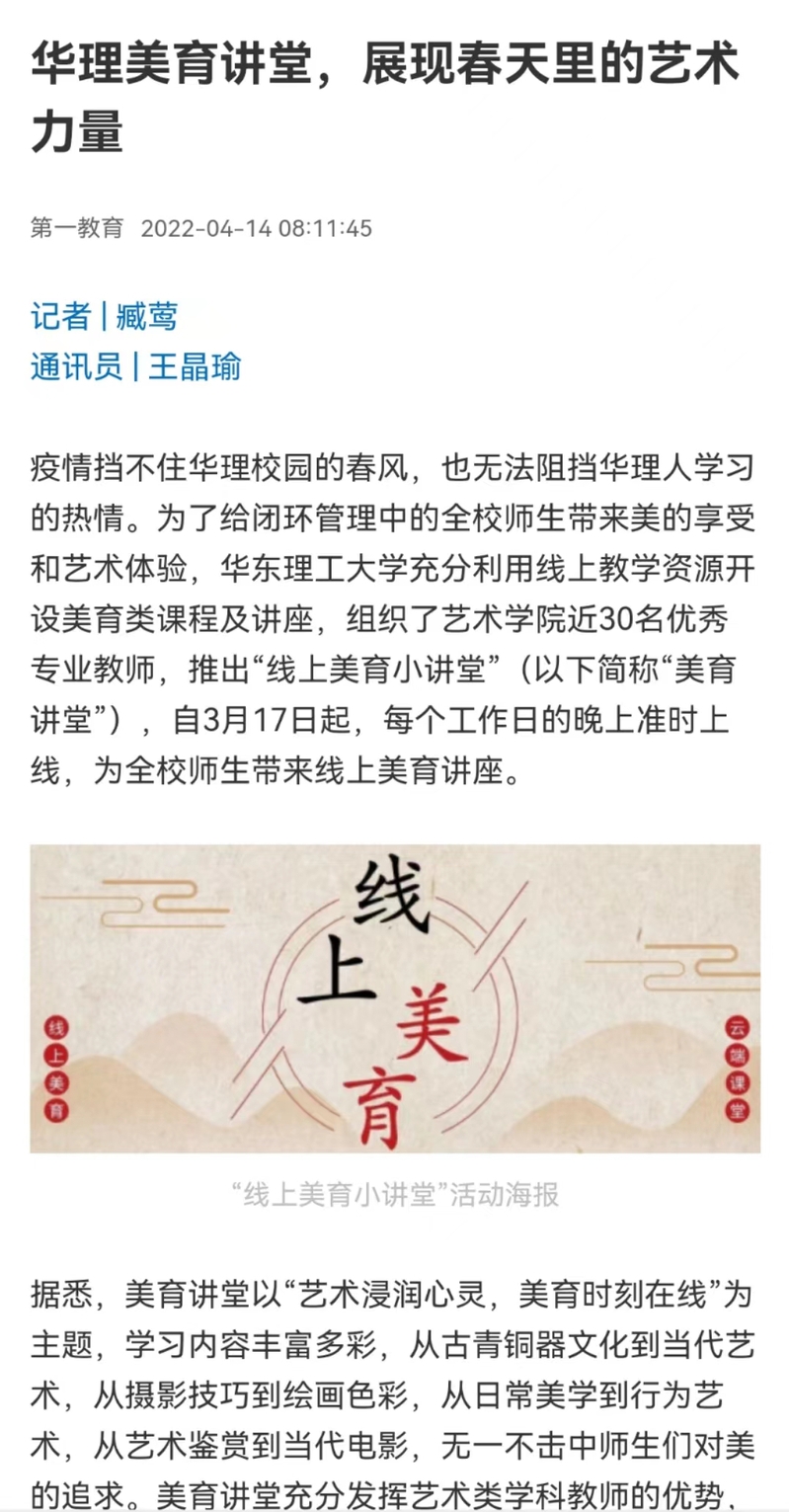 疫情挡不住华理校园的春风,也无法阻挡华理人学习的热情。为了给闭环管理中的全校师生带来美的享受和艺术体验,华东理工大学充分利用线上教学资源开设美育类课程及讲座,组织了艺术学院近30名优秀专业教师,推出“线上美育小讲堂”(以下简称“美育讲堂”),自3月17日起,每个工作日的晚上准时上线,为全校师生带来线上美育讲座。