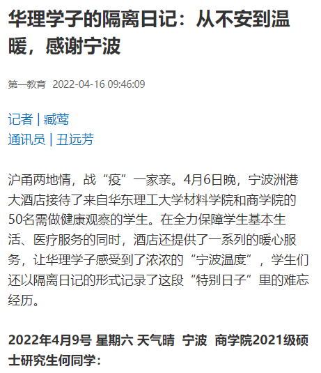 沪甬两地情,战“疫”一家亲。4月6日晚,宁波洲港大酒店接待了来自华东理工大学材料学院和商学院的50名需做健康观察的学生。在全力保障学生基本生活、医疗服务的同时,酒店还提供了一系列的暖心服务,让华理学子感受到了浓浓的“宁波温度”,学生们还以隔离日记的形式记录了这段“特别日子”里的难忘经历。