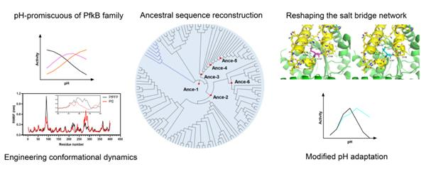 后续,研究团队利用祖先序列重建,推断并复活了PfkB家族的6个祖先酶。体外催化实验表明,祖先酶也具有pH混乱性。在序列比对具有不同遗传关系的PfkB家族成员时,发现了一段未被标注的氨基酸短序列,该序列在不同属来源酶之间差异很大,但在同一属中保守。结合结构和功能分析,研究团队猜测该区域很可能包含影响pH的残基。湿实验证实,在该区域理性设计突变即可显著改变酶的pH适应性甚至最适pH值。研究人员分析认为,这是由活性中心附近的盐桥网络改变所引起的,据此提出了一种有针对性的内源性微环境工程策略,即通过靶向改变盐桥网络来改变酶的pH适应性。该工作首次从进化角度考虑酶的最适pH值的影响因素,为酶促pH适应性工程提供了有趣的新见解。