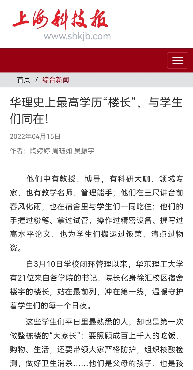 【上海科技报】华理史上最高学历“楼长”,与学生们同在!