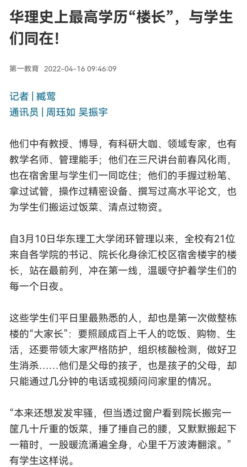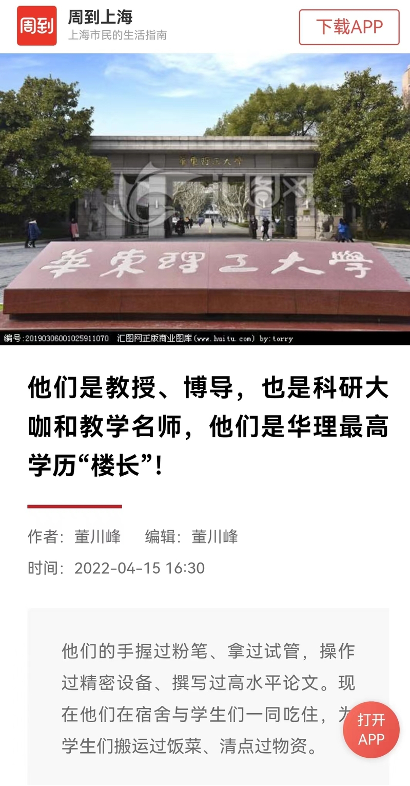 自3月10日学校闭环管理以来,华东理工大学有21位来自各学院的书记、院长化身徐汇校区宿舍楼宇的楼长,站在最前列,冲在第一线,温暖守护着学生们的每一个日夜。
