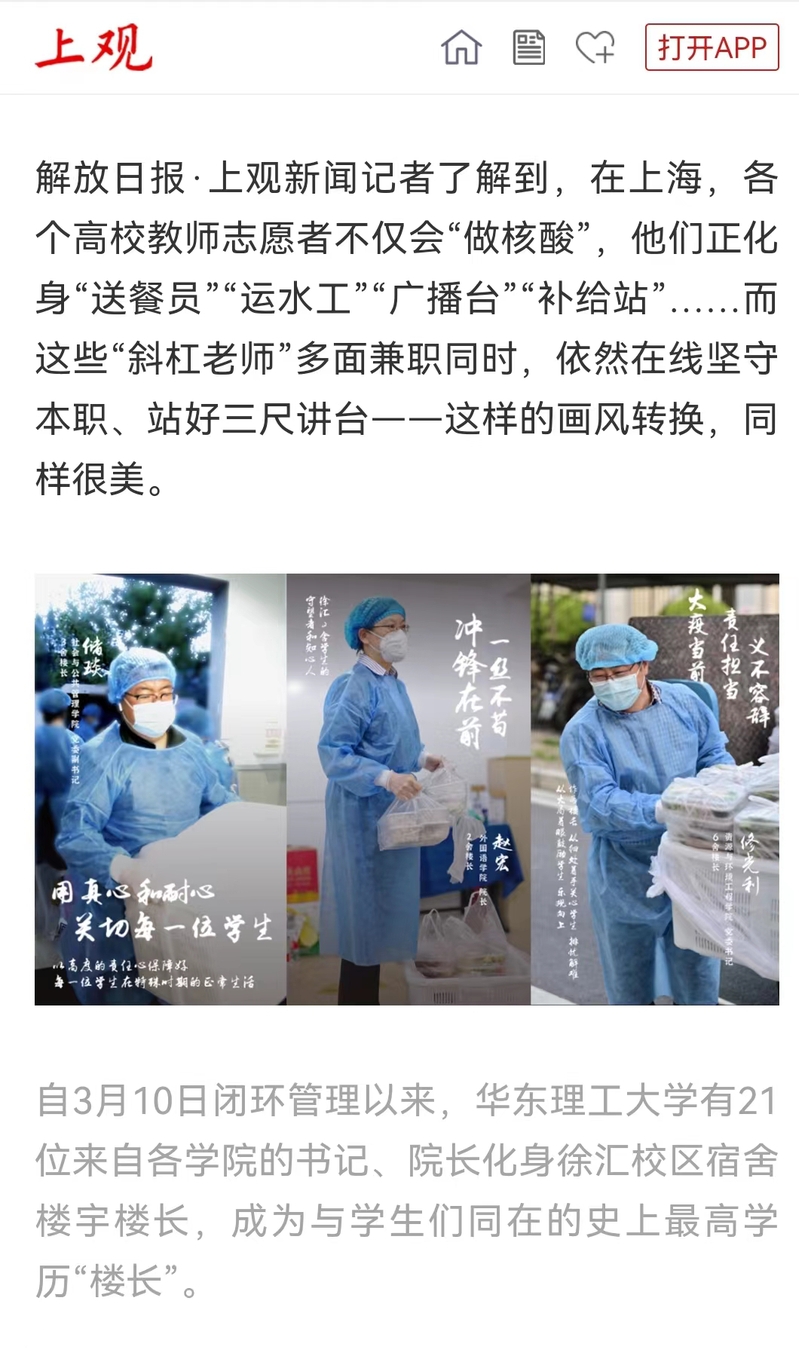 自3月10日学校闭环管理以来,全校有21位来自各学院的书记、院长化身徐汇校区宿舍楼宇的楼长,站在最前列,冲在第一线,温暖守护着学生们的每一个日夜。央广网、上观新闻、周到上海、第一教育、上海科技报等多家媒体进行了报道。