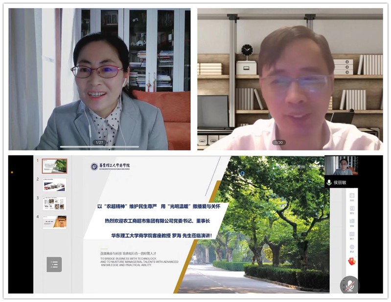 “农超精神”使商学院每一位教职工深受启发。侯丽敏代表商学院全体教职工向农工商超市集团表示感谢。她提到,近两年商学院的行动学习实践得以不断深化,多个项目取得了不俗的成绩。疫情初期,农工商超市更是为商学院师生提供了最及时、最无私的物资供给。马铁驹表示,农工商超市始终秉承着勇于担当与创新的精神。他感谢农工商超市集团和罗海先生给予华理商学院师生一以贯之的支持和关注,期待疫情结束后双方的进一步合作。
