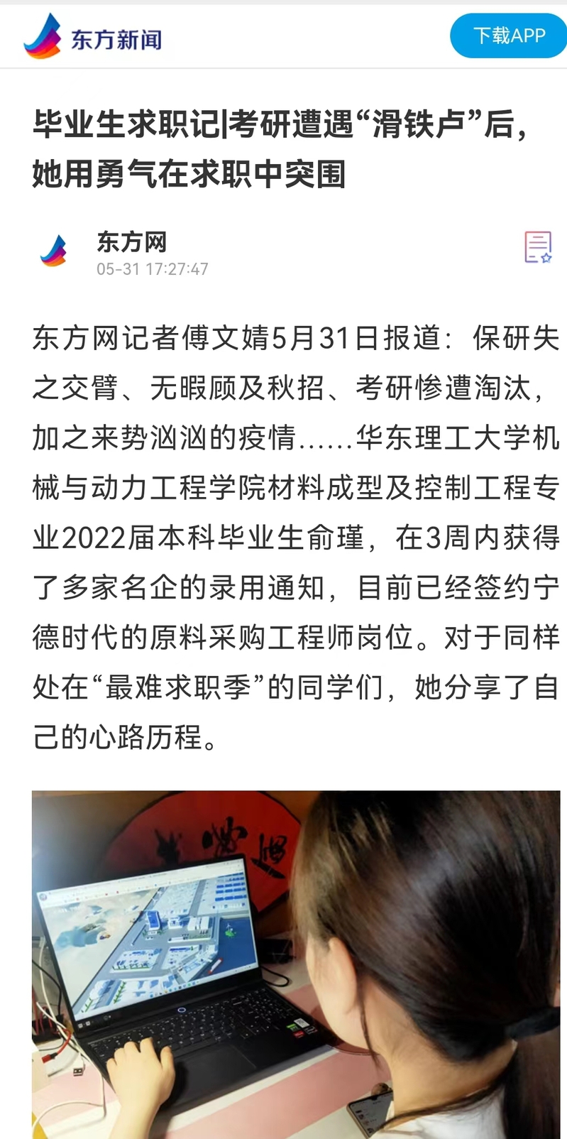 疫情期间,机动学院2022届本科毕业生俞瑾在考研遭遇“滑铁卢”、学校实行闭环管理的压力下,直面困境,通过努力3周内获得东风康明斯、星宏智能、链家、锦湖日丽等多家企业的录用,现已签约宁德时代原料采购工程师岗位。中国青年报客户端、上观新闻、新民周刊、青春上海、东方网、周到上海、第一教育、上海科技报等近10家媒体进行了原发报道,本篇选取了部分报道予以转载。